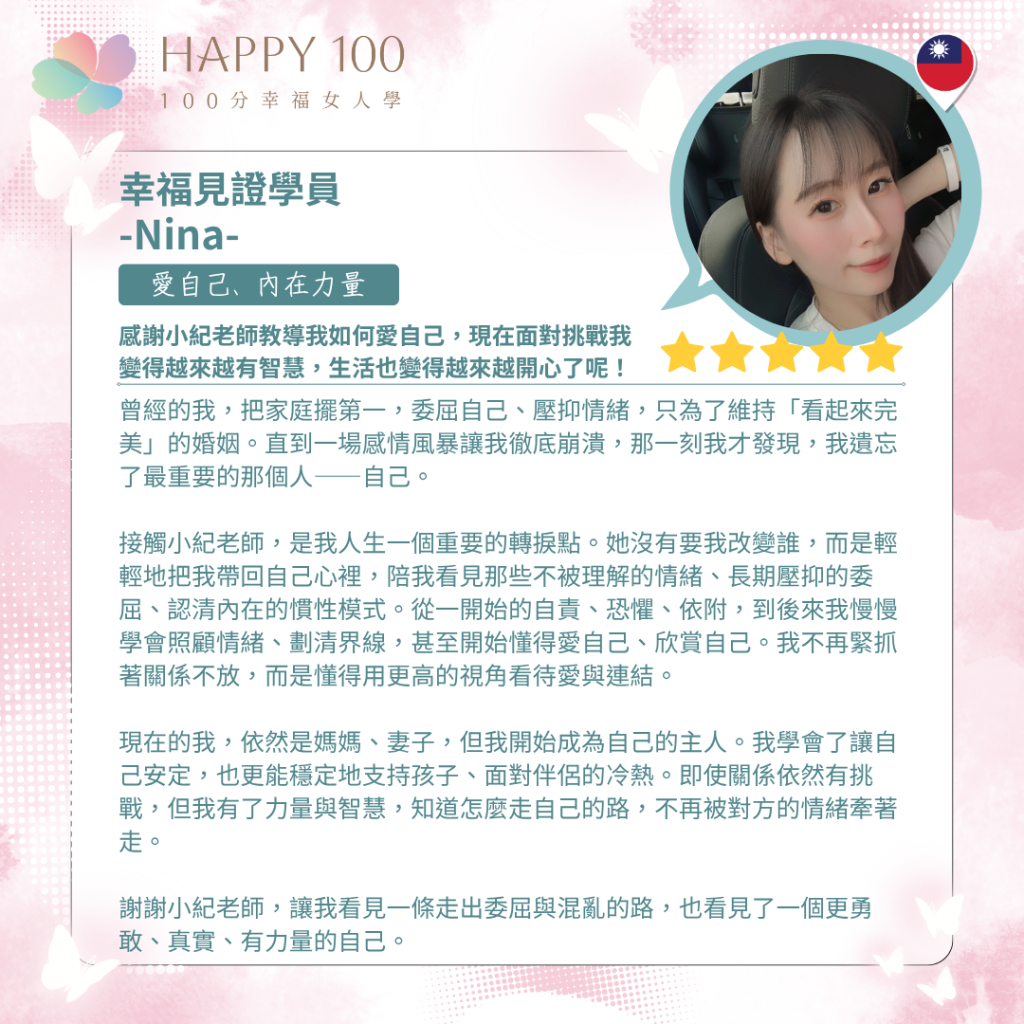 ✨ 《100分幸福女人學》課程,由小紀老師親自設計,帶妳一步步看見潛意識中的盲點,學會建立清晰的邊界,找到屬於自己的價值與定位。